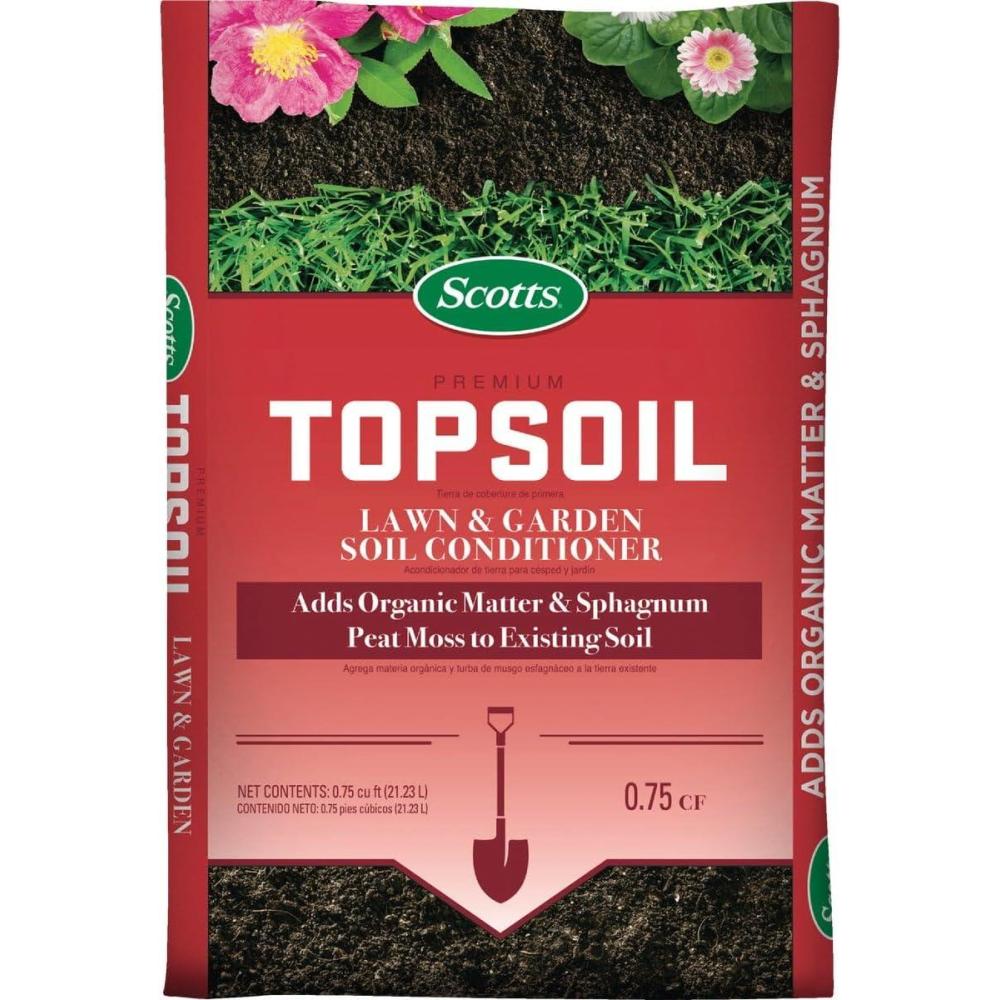 Scotts, .75 cuft, premium top soil, consistent Texture, with no rocks or sticks, premium blend of organic materials plus peat Moss for improved root development, good all purpose soil for planting, seeding, filling & leveling, contains organic materials, peat, composted forest products, aged rice hulls, or compost & sphagnum peat Moss.
